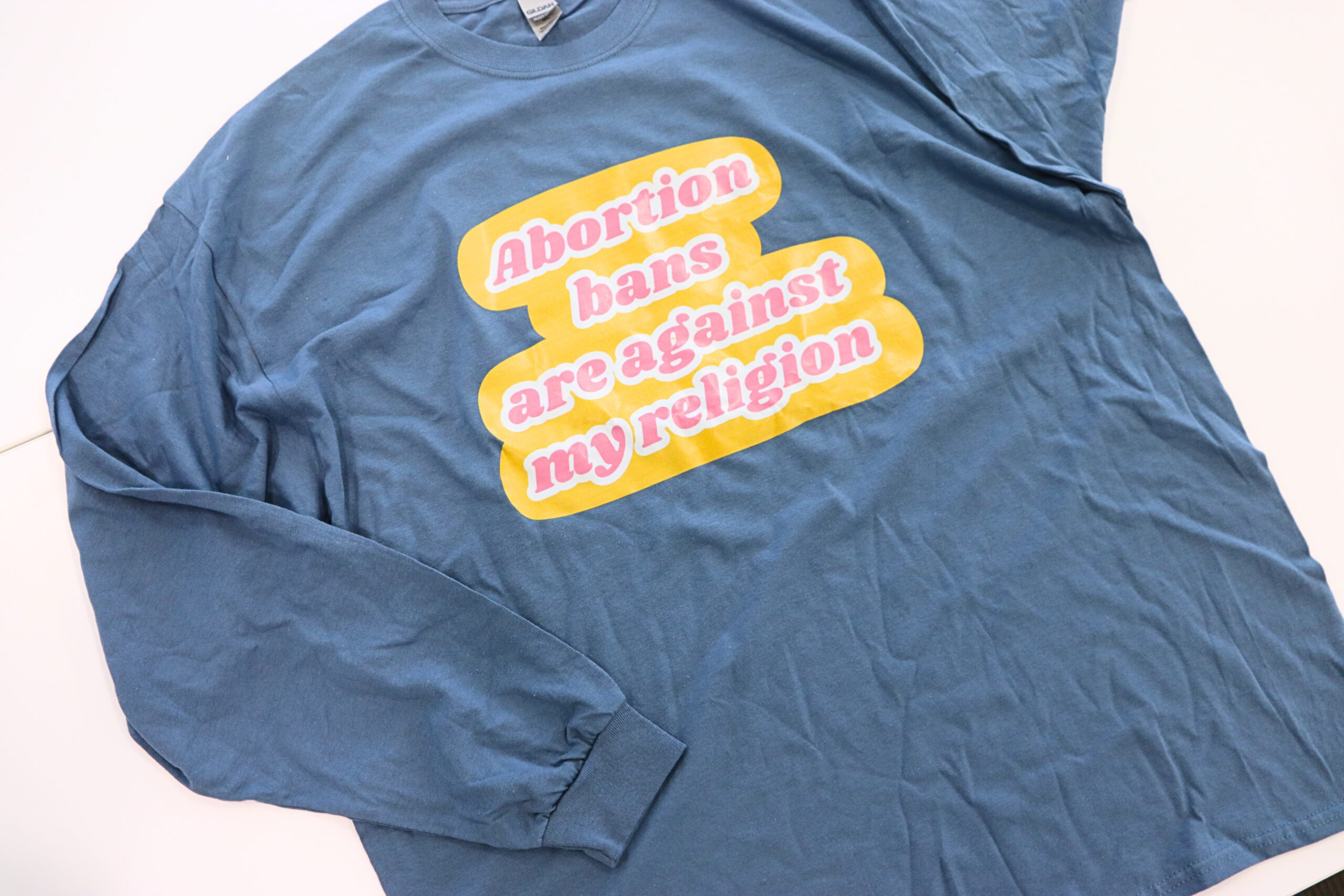 Our Jews for Repro long sleeve will have you looking and feeling your best year-round. Dressed up for a day at work or a calm night in, you really can’t go wrong repping NCJW NY. The 100% sky blue cotton material sets apart our yellow and pink messaging, which reads “Abortion bans are against my religion.” And, on the back, our trademark Jews for Repro logo stands as a proud feature.